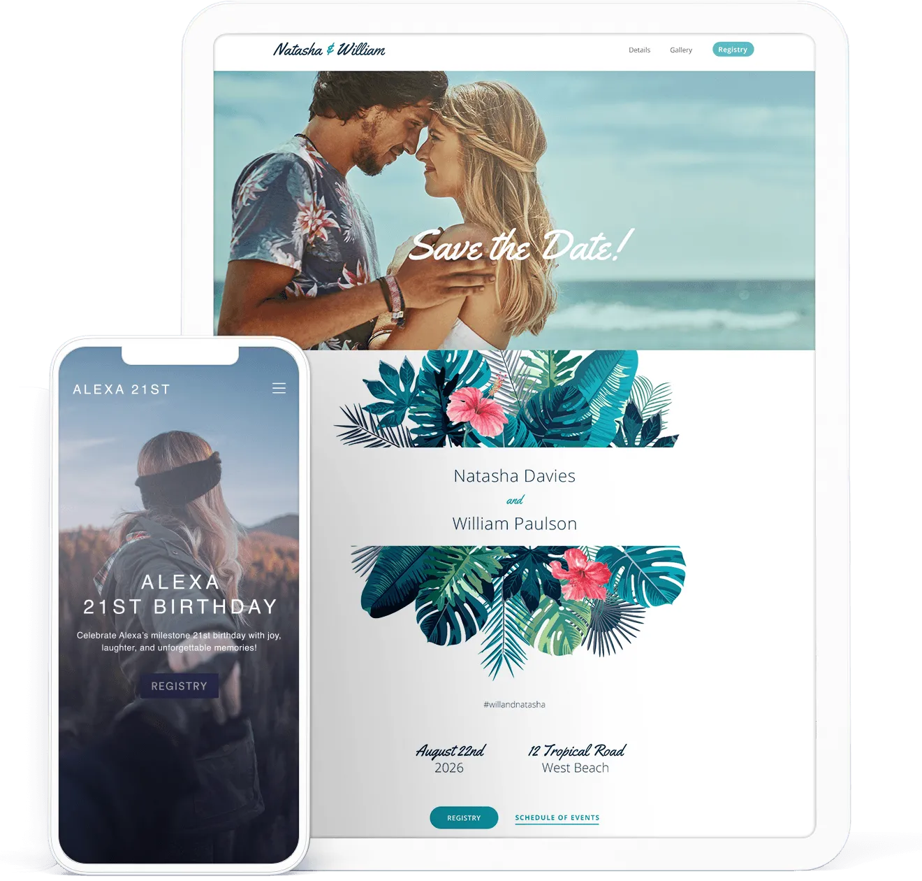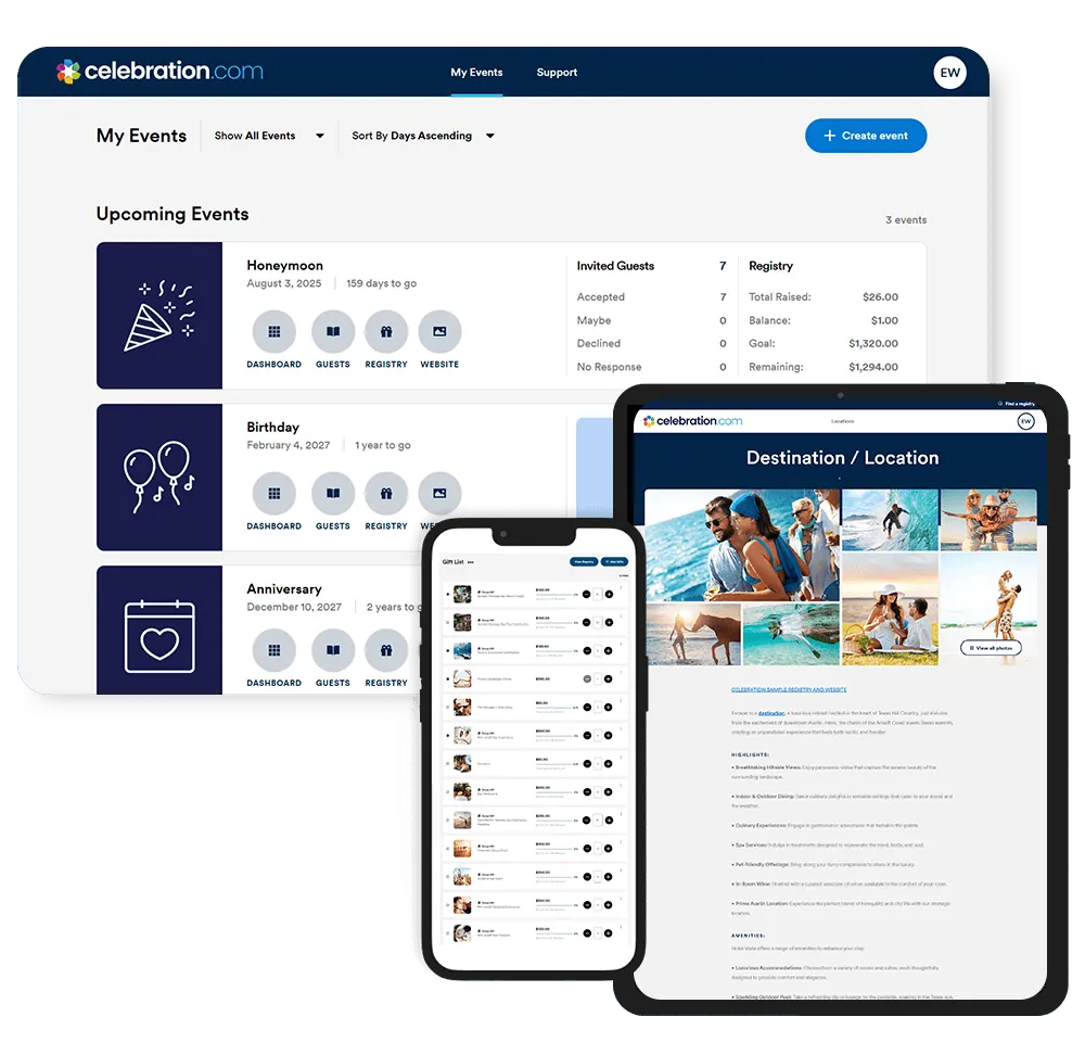 Distribute event invitations traditionally or virtually. Share your event website with friends and family to receive registry contributions!